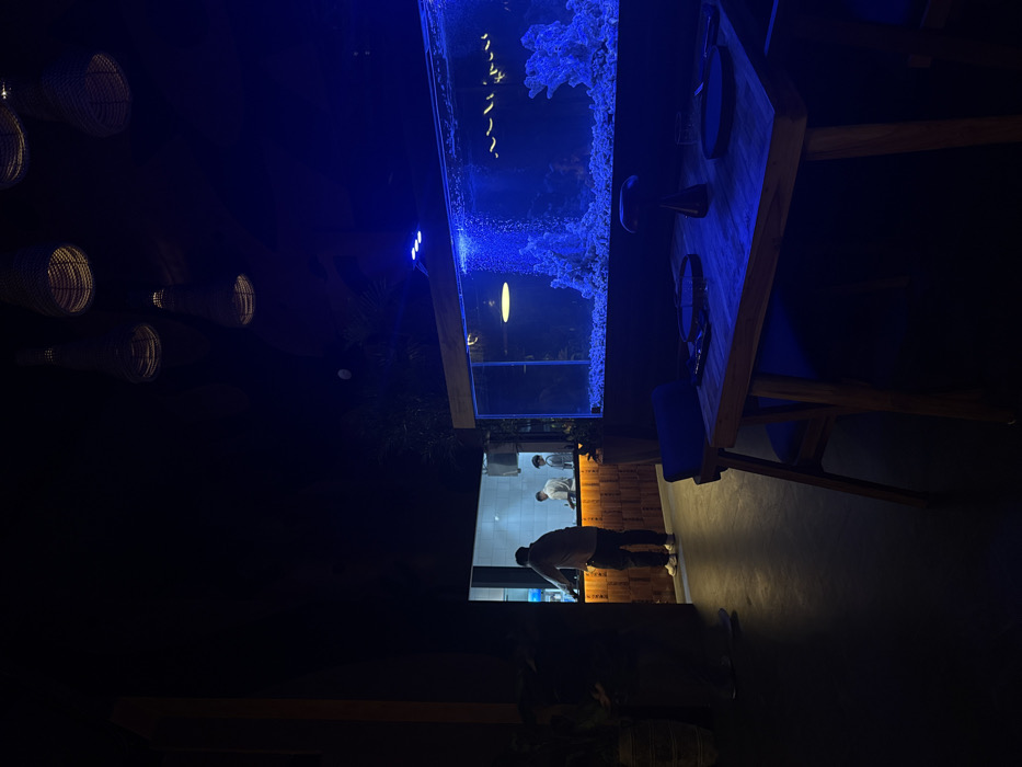 The scene depicts a dimly lit restaurant interior in Ubud, Indonesia, characterized by modern, minimalist decor. In the foreground to the right, a rectangular wooden dining table is set for two, featuring dark plates and a dark, mushroom-shaped table lamp. Two wooden chairs with dark cushions are positioned at the table. To the right of the table, a prominent, elongated aquarium serves as a decorative element, illuminated by blue light. The aquarium contains white gravel, intricate blue coral-like structures, and exhibits active bubbling, suggesting an aquatic environment, though specific marine life is not clearly discernible. Above the aquarium, three blue spotlights are mounted. In the midground to the left, a man in a light-colored shirt and dark pants stands, leaning forward at a textured wooden counter that glows with an amber light strip along its top edge. Behind this counter, through a rectangular opening, a brightly lit kitchen area is visible. Inside the kitchen, two individuals in white uniforms or chef's coats are present, engaged in tasks; one is more clearly visible near the left side of the opening, and the other is further back to the right. The ceiling is dark, from which several woven, conical pendant lamps with warm internal light hang at varying heights. The walls and floor are predominantly dark, with a visible dark column on the left and some dark foliage behind the aquarium. The overall environment suggests an evening setting within a contemporary dining establishment.