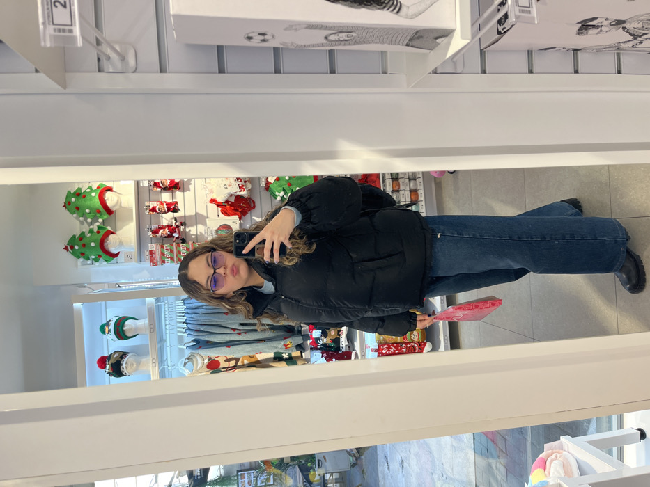 A young female, with wavy brown hair and purple-tinted glasses, is depicted taking a mirror selfie inside a retail store in Valencia, Spain. She is wearing a black puffer jacket, a light blue long-sleeved top, wide-leg blue jeans, and black chunky-soled boots. Her right hand holds a black smartphone, angled for the photograph, and her lips are puckered. In her left hand, she holds a small pink pouch. The background, visible in the mirror's reflection, shows a brightly lit store interior with white slatwall shelving systems. The merchandise prominently features Christmas-themed items, including green Christmas tree hats on white mannequin heads, other novelty beanies, hanging Christmas sweaters, red and white stockings, and small elf figurines. Price tags are visible on various items. On the far right, white boxes with black line art illustrations are displayed on shelves. The floor is light-colored and reflective.