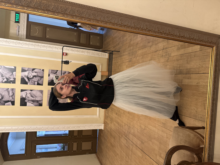 A woman in a black track jacket and white tutu takes a mirror selfie with her phone. The mirror reflects a wooden floor, a portion of a vintage chair, and a hallway with an exit sign. Behind her is a wall adorned with black and white portraits and a large, ornate wooden door. The room appears to be a historical building with intricate architectural details.