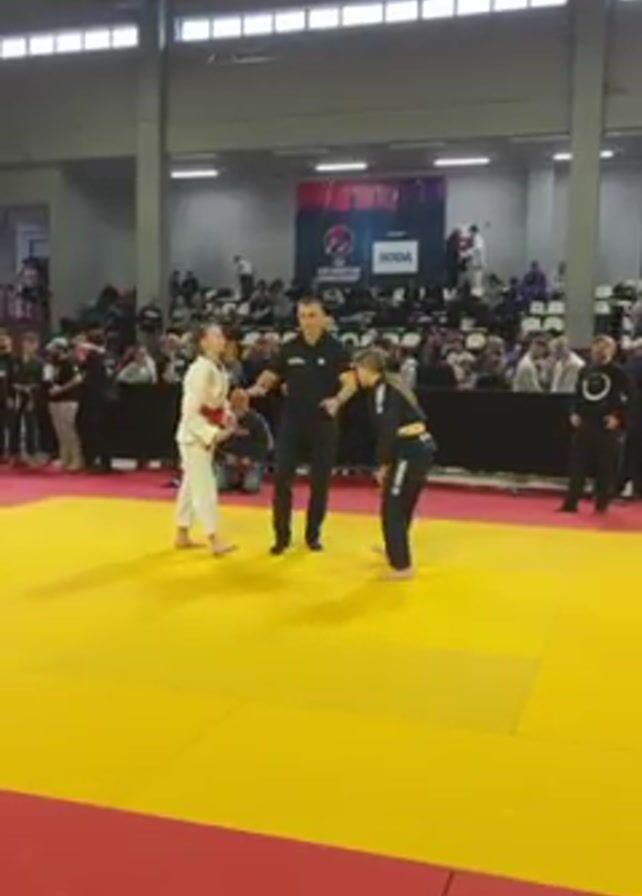 martial arts competition between two female competitors in a large indoor arena