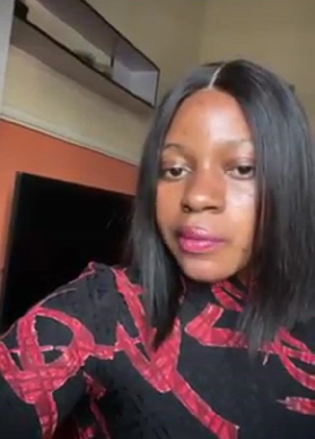 A young woman with straight black hair is facing the camera. She's wearing a black, long-sleeved top with a red abstract pattern. The background includes a cream-colored wall, white crown molding, an orange accent wall, a black television, and a white shelf. The woman appears to be talking, as her lips are moving.