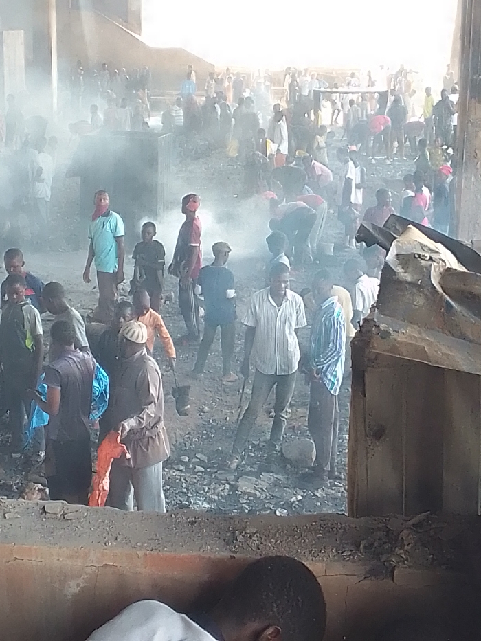 scene of chaos and destruction, possibly in the aftermath of a fire or other disaster. The location, based on the coordinates provided, is somewhere in Jos, Nigeria. The scene is characterized by a thick haze of smoke, indicating a recent event. People are gathered in the scene, some appearing to be onlookers, others involved in cleanup or recovery efforts. Debris, some of it charred, is visible, indicating the extent of the damage. The image was taken from a vantage point looking down into the scene. There is a partial view of a building, possibly a structure that has been partially destroyed. The scene is a testament to the aftermath of a significant event, reflecting both the destruction caused and the resilience of the people.
