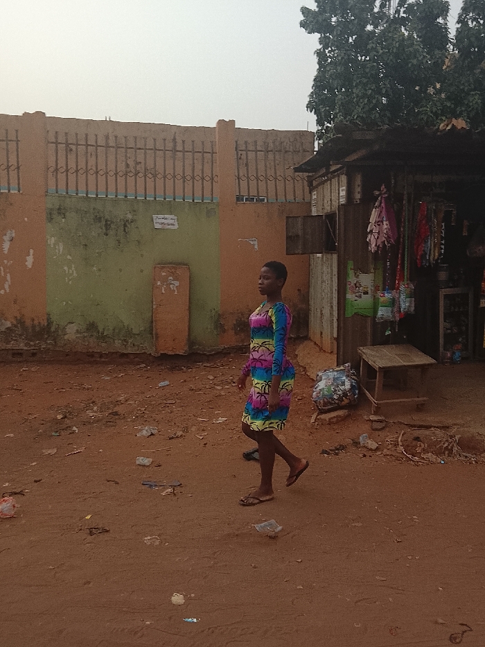 - "A young woman with short dark hair and dark skin is depicted walking from left to right across a reddish-brown dirt ground in Onitsha, Nigeria" by FM-mJtZ02, licensed under CC BY 4.0