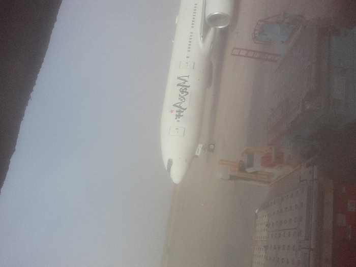 An airplane with the name "Axiom" in reverse lettering sits on a tarmac in heavy fog. Beside the airplane are buildings with scaffolding and an access ladder. A yellow tow tractor sits nearby. The fog obscures the scene, making details difficult to discern.
