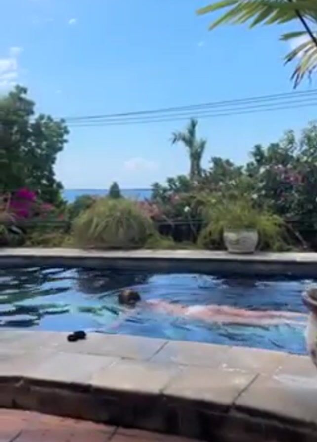 A video depicts a person swimming in a pool. The pool is surrounded by tile and lush greenery, including trees and flowering plants. In the background, the ocean is visible under a clear blue sky with some scattered clouds. Overhead power lines stretch across the sky. The camera is stationary.