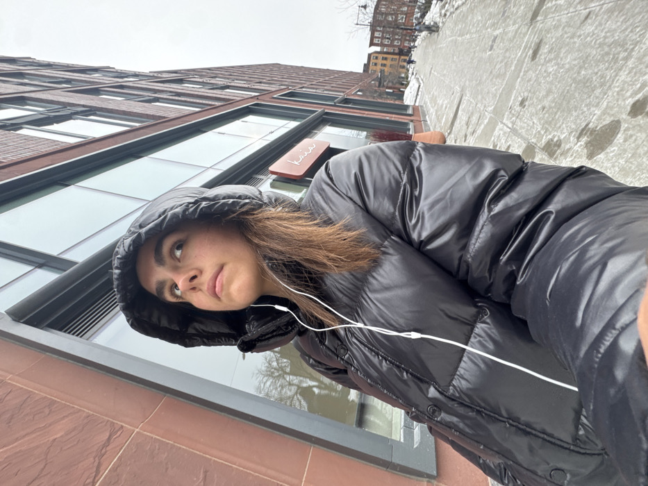 A young woman in a hooded black puffer jacket is angled towards the camera. She wears wired earbuds. Behind her is a tall brick building with large windows and a sign above what appears to be an entrance. The sky is overcast. The background includes a snowy sidewalk and other buildings in the distance, giving the impression of an urban setting.