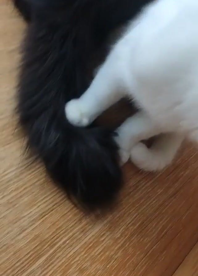 On a wooden floor, a white cat interacts with the tail of a black cat. The white cat first places its paw on the black tail, then sniffs it. The camera angle is from above.