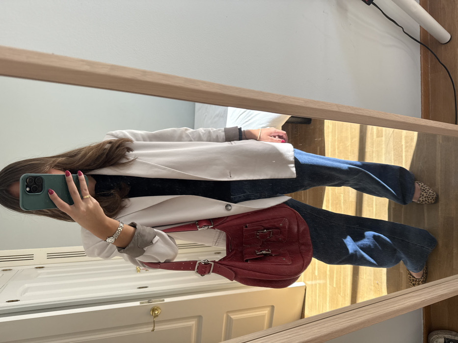 A female individual is depicted taking a full-body mirror selfie indoors, in what appears to be a residential bedroom or dressing area in Unknown, Unknown. The individual, with long brown hair, is wearing a light beige blazer over a black top, dark blue wide-leg jeans, and leopard print flat shoes. A large, red, hobo-style shoulder bag with two front pockets is carried on her left arm. A silver-toned watch and bracelet are visible on her left wrist, and a gold-toned ring is on her left ring finger. Her fingernails are painted red. She holds a dark green smartphone in her right hand to capture the reflection. The background, visible in the mirror, features light-colored wooden parquet flooring with sunlit areas and shadows, light blue-grey walls, a white closed door with a gold-toned doorknob on the left, and a bed with white bedding partially visible on the right. The mirror has a light wooden frame. A white object with a black cable is partially visible to the far right of the mirror's frame.