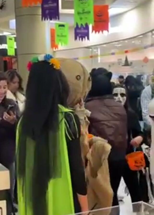 people in costumes at an indoor event, possibly a mall or shopping center, decorated for Halloween