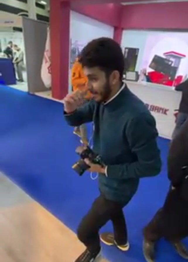 The video begins with a medium shot of a man wearing a teal sweater, black pants, and grey sneakers holding a DSLR camera and smelling his fingers. He is standing on a blue carpet in front of a booth labeled "CHAMBANK". In the background, another person wearing an orange jacket is looking at their phone. The camera then moves rapidly to the right, blurring the view, before focusing on a man seated in a chair in front of a large portrait. The camera then pivots to show a meeting space with several people seated in chairs, one of whom is gesturing towards a screen. The background shows a sign that reads "paylinks".
