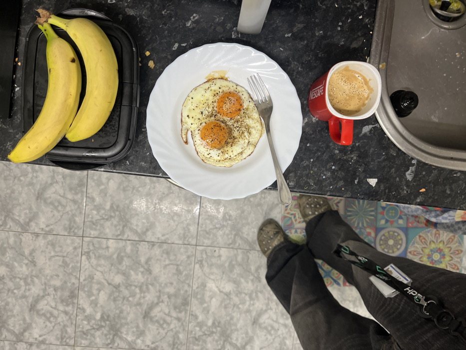 The image depicts an indoor scene, likely a kitchen, within the city of Barcelona, Spain. On a dark, speckled countertop, a white ceramic plate holds two fried eggs, seasoned with black pepper, with a silver fork resting on its left side. To the upper right of the plate, two ripe yellow bananas are placed on a black, ridged plastic container. A red Nescafé branded mug containing a light brown beverage, consistent with coffee, is situated near a stainless steel sink with a black drain stopper. The floor consists of light grey square tiles, and a patterned rug with geometric and mandala-like designs in various colors is partially visible beneath a person's legs. The person is wearing dark trousers and grey, textured shoes, standing over the rug. A black lanyard, featuring "HP" branding, is attached to a set of keys and hangs from the left leg.