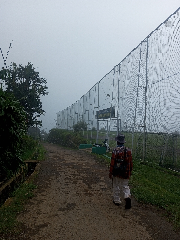 The image depicts an outdoor scene on an overcast or foggy day in what is described as the city of Irupalai, Sri Lanka. A single individual, viewed from behind, walks away from the camera on an unpaved dirt path. This person wears a dark bucket hat, a long-sleeved shirt with red, white, and dark patterned designs, light-colored trousers, and dark footwear. A dark backpack is worn, and a slender stick or cane is held in the right hand. The dirt path, featuring darker wet patches, curves slightly to the left as it ascends. To the left of the path, dense tropical foliage, including palm trees, lines the area, with a visible concrete drainage ditch at the path's edge. To the right of the path, a tall, grey metal post and wire mesh fence encloses a large green grassy field, likely a sports ground. Mounted on the fence structure, above a metal gate, is a dark sign with light-colored text, which reads: "SELAMAT DATANG DI PANCASILA YOUTH CAMP 2017" (Welcome to Pancasila Youth Camp 2017). Two floodlights are attached to the fence posts, facing into the enclosed area. Below the fence, a small embankment features green-painted low barriers. A light-colored scooter or motorcycle is parked on the grassy area inside the fence, near the gate. The sky is uniformly light grey, indicating heavy cloud cover or fog, limiting visibility of the horizon.
