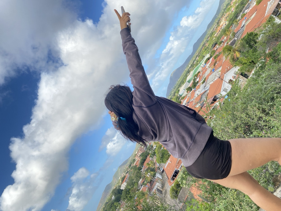 A young woman stands on a high vantage point with a sprawling cityscape visible in the background. She has dark hair pulled back into a ponytail and is wearing a dark jacket and shorts. Her right arm is raised, making a peace sign while holding a phone. The sky is bright blue with puffy white clouds. Green vegetation surrounds her, and red-tiled roofs of the houses below create a patterned landscape.