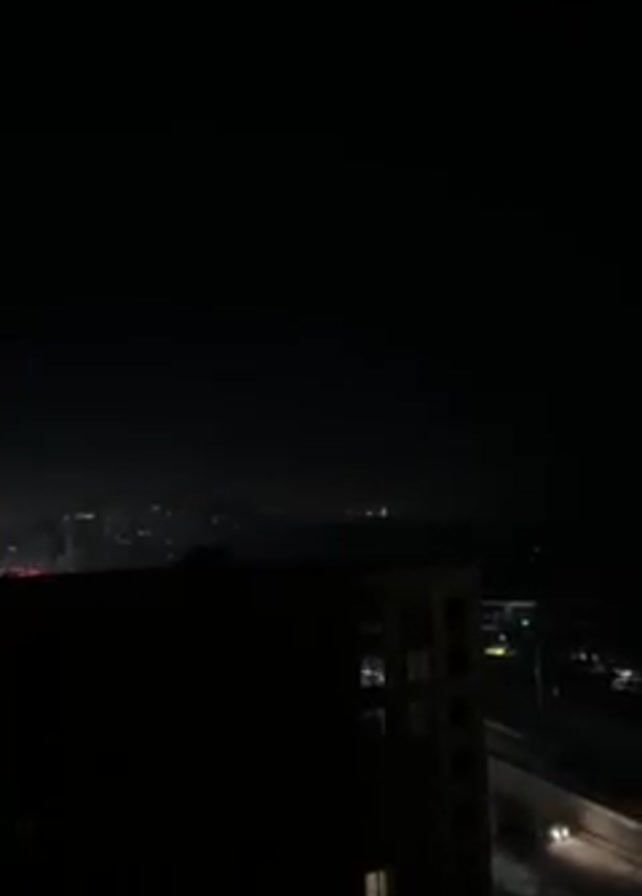 night cityscape from a high vantage point, likely a building. The scene is very dark, but distant city lights are visible on the horizon. Buildings are silhouetted in the foreground. Traffic passes on a road below.