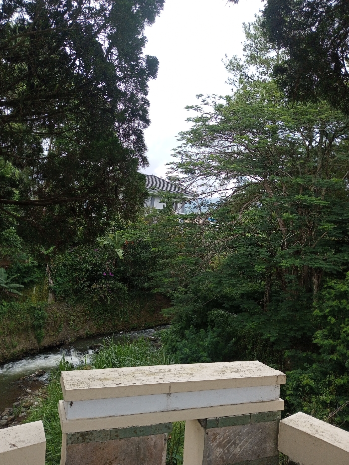 A view through lush greenery captures a river flowing beneath a concrete structure. Tall trees frame the scene, partly obscuring a building with a striped roof. The setting suggests a natural landscape with human-made elements blending into the environment. Cloudy skies fill the background.