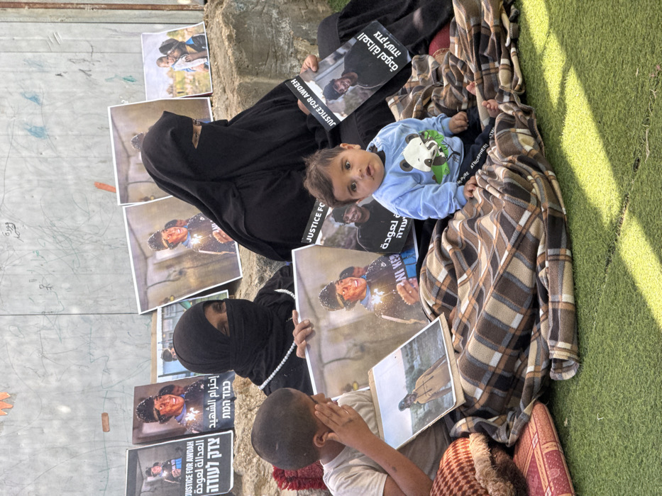 This image, captured in Dura, Palestinian Territory, depicts four individuals seated outdoors on artificial green turf, with a light-colored concrete wall in the background. A brown and beige plaid blanket covers a significant portion of the foreground. On the left, a young boy in a light-colored t-shirt holds a portrait of a young man in a yellow hoodie. In the center foreground, an infant wearing a light blue long-sleeved shirt with a panda graphic sits upright, looking directly at the camera. Behind them, two adult women, both wearing black niqabs that obscure their faces except for their eyes, are seated. The woman on the left holds a large portrait of a young man in a red cap and glasses, holding a lit sparkler. The woman on the right holds a different portrait of a young man, featuring the text "JUSTICE FOR AWDEH" in English and "צדק לעודה" (Justice for Awdeh) in Hebrew. Several additional copies of the portrait showing the young man with the sparkler are propped against the concrete wall in the background. Some of these posters bear text in English ("JUSTICE FOR AWDAH"), Arabic ("احترام الشهيد" - Respect the martyr), and Hebrew ("כבוד המת" - Honor the dead, and "צדק לעודה"). A smaller portrait of an adult holding a child is also visible against the wall. The wall itself has faint markings and Arabic script, including the word "Dura". Two patterned pillows are visible on the far left, partially covered by the blanket. Natural daylight illuminates the scene.