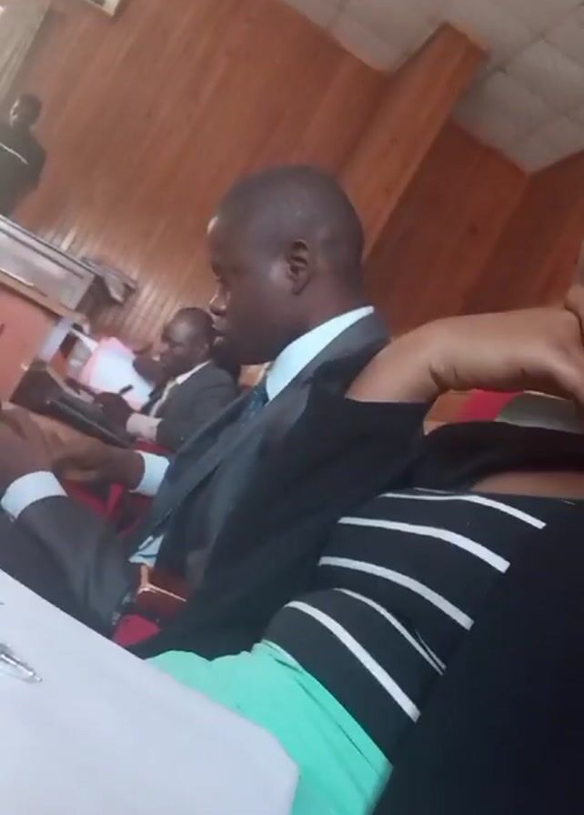 The video appears to be a selfie taken by a woman inside a room with wooden walls and ceiling. Other people, mostly men, are seated in the background. The woman has her hand on her face and looks at the camera. A man in a suit is seated next to her and is looking at his phone. The video is blurry and shaky.