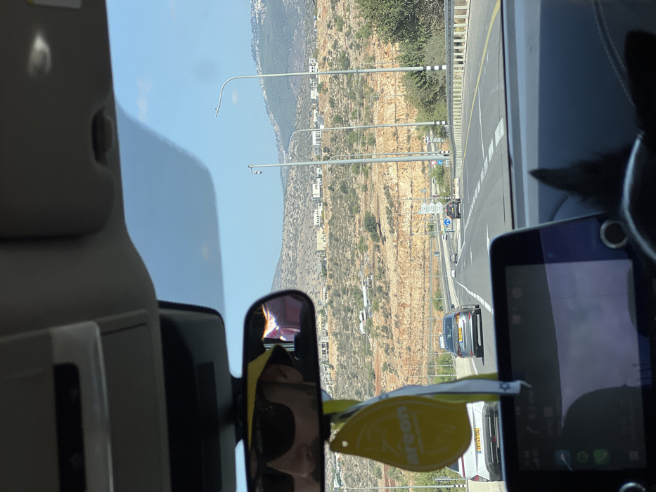 The image depicts a daytime scene from the interior of a vehicle traveling on a multi-lane highway within the Merom HaGalil Regional Council, Israel