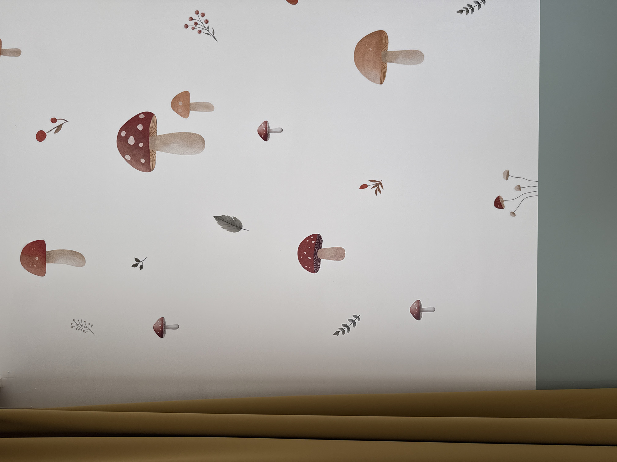 The image displays a segment of an interior wall decorated with botanical motifs. The wall is predominantly white, featuring numerous decal or sticker illustrations. These include mushrooms of various sizes, with caps ranging from red with white spots to solid brown, and small clusters of stylized leaves, branches, and red berries. A prominent golden-brown curtain or drape occupies the left vertical fifth of the frame, hanging flush against the wall. The lower portion of the wall, approximately the bottom fifth, is painted a solid muted green, creating a distinct horizontal border. No individuals, explicit actions, or interactions are visible. The specific location within the city of Sofia, Bulgaria, cannot be determined from the visual evidence provided.