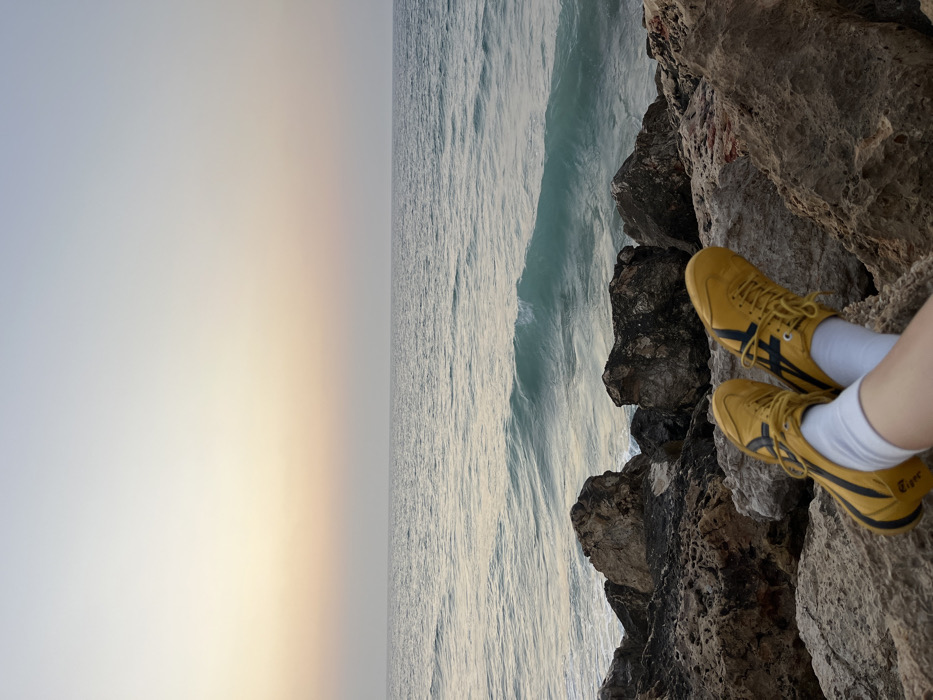 A first-person perspective image depicts a rocky coastline in Tel Aviv, Israel, during a sunset or sunrise. In the immediate foreground, the lower legs and feet of an individual are visible, clad in white ankle socks and yellow Onitsuka Tiger athletic shoes featuring black stripes and branding. The feet are positioned with heels resting on or above a weathered, multi-hued rock formation composed of light brown and grey stones. Beyond the rocks, the Mediterranean Sea stretches towards the horizon, exhibiting moderate surface chop and a distinct turquoise wave cresting in the mid-left portion of the frame. The sky above is a gradient blend, transitioning from a pale blue-grey at the top to a soft peach and orange hue at the horizon line, indicative of diffused natural light.