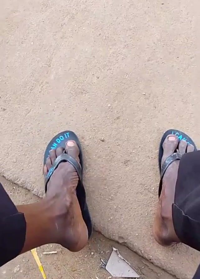 pair of dark-skinned feet wearing black flip-flops with blue writing that says "I CAN DO IT" on each foot. The feet are positioned on a light brown, concrete or asphalt surface with bits of debris scattered around. The person is wearing black pants. The camera angle is from above, looking down at the feet.