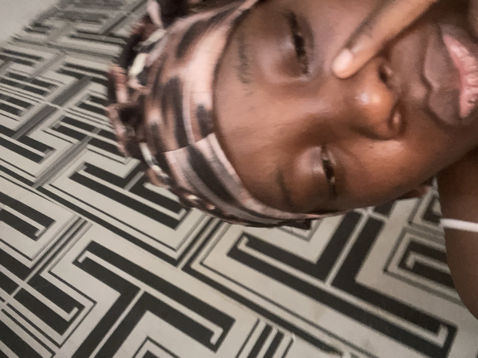 A close-up, slightly blurry image depicts an adult female indoors. The subject, with dark skin, wears a patterned headwrap in brown and black tones, covering her hair. Her eyes are partially closed or looking downward, and her right index finger is pressed against the right side of her nose. A white strap, likely from an undergarment or top, is visible on her lower left side. The background consists of a wall covered with wallpaper featuring a repeating geometric pattern of interlocking black and white or light grey lines, creating an abstract, maze-like design. The pattern is oriented diagonally within the frame. The specific location within the city of Lokoja, Nigeria, cannot be determined from the visual information provided in the image.