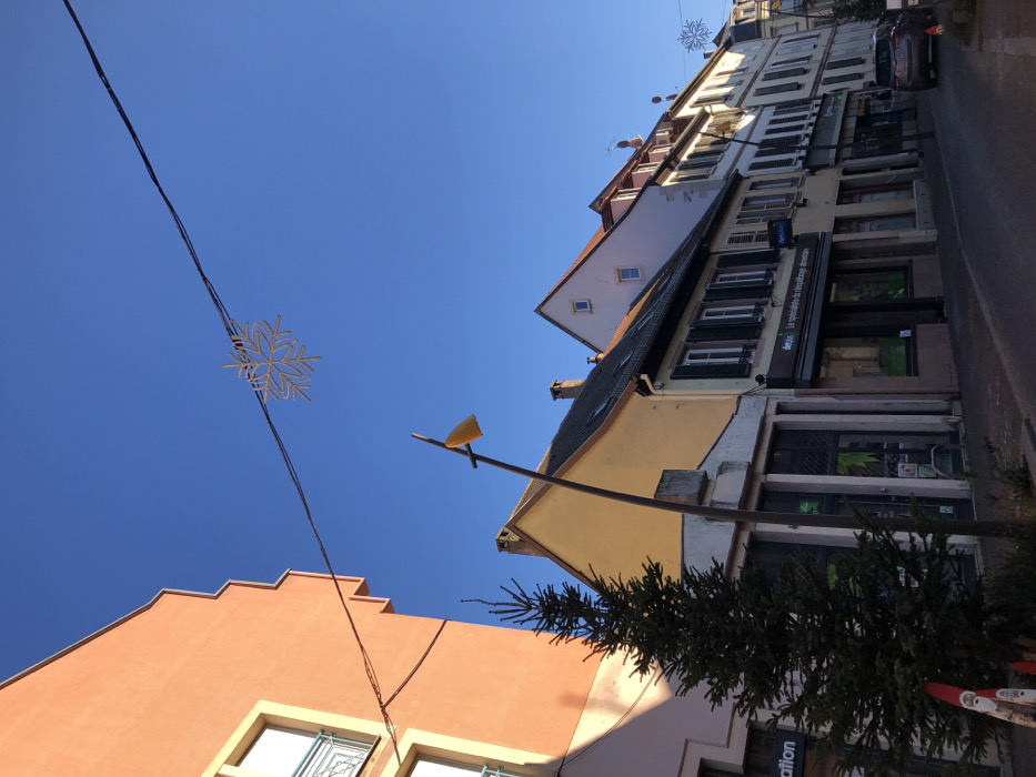The image depicts a street scene in the city of Saverne, France, under a clear, deep blue sky. The perspective is looking up along a street lined with multi-story buildings. On the far left, a tall building with a terracotta-colored facade features a distinctive stepped gable roofline and light-framed windows, one with a teal balcony railing. Adjacent to it, a large, conical evergreen tree stands on the sidewalk. A dark, leaning streetlamp post with a yellow light fixture is positioned in the foreground, slightly to the right of the tree. Moving right, a series of buildings display varied architectural styles and colors, including a prominent yellow building and several white or light-colored structures with dark-shuttered windows. Some buildings feature gabled roofs and chimneys. Shopfronts are visible at street level; one store displays "detox" and "La spécialité du rééquilibrage alimentaire" signage. The street itself is visible on the right, with a dark-colored SUV-type vehicle partially parked at the curb. Overhead, dark utility cables stretch across the sky, from which two illuminated white snowflake decorations are suspended, indicating seasonal ornamentation. Strong sunlight casts distinct shadows from the buildings onto the street and facades. No individuals are present in the scene.