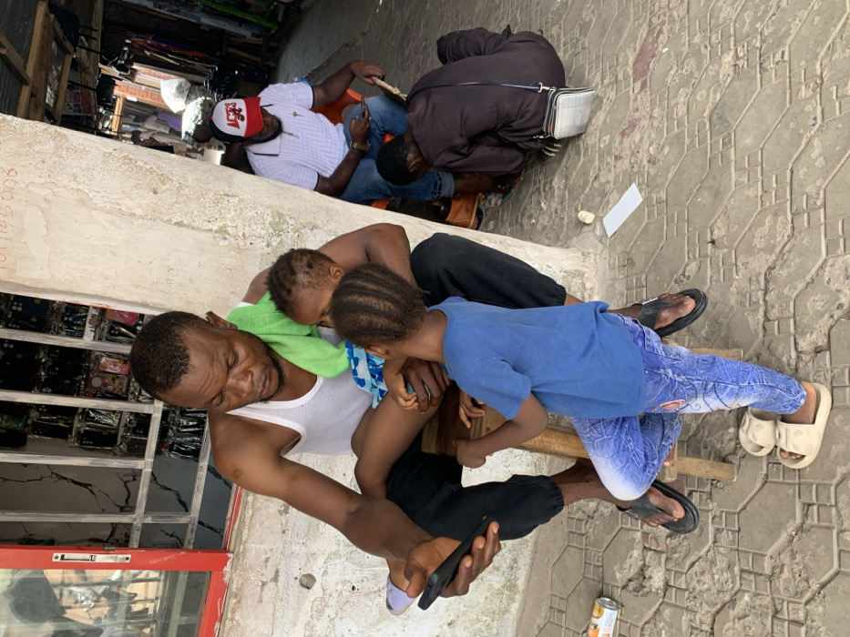 The scene depicts a street or market area in Lokoja, Nigeria, with multiple individuals present. In the foreground, an adult male, wearing a white tank top and black pants with black flip-flops, is seated on a low wooden stool, holding a black smartphone in his left hand. A green towel is draped around his neck. He is holding a small child, dressed in a blue patterned outfit, on his lap. Another child, wearing a blue t-shirt, blue and white patterned jeans, and light-colored sandals, stands facing the man, resting their right elbow on the man's left leg. The man appears focused on the smartphone. Behind the man and children, a weathered concrete pillar is visible. To the left, a storefront with a red frame displays numerous phone cases arranged on shelves. The window glass shows cracks. A white paper with red numbers "1019145008" is affixed to the wall above the window. On the paved ground near the man's feet, a discarded beverage can (possibly Fanta) and a piece of white paper are visible. In the mid-ground, to the right of the concrete pillar, another adult male is seated on a red plastic chair. He wears a white polo shirt, blue jeans, and a white baseball cap with a red brim and a white logo that reads "ACES". He is also looking down at a smartphone in his hands. Directly in front of him, on the ground, another individual is crouched or kneeling, wearing dark clothing and a small, light-colored shoulder bag with a checkered pattern. The ground is paved with patterned grey tiles. The background suggests a bustling outdoor market environment with further stalls and structures.