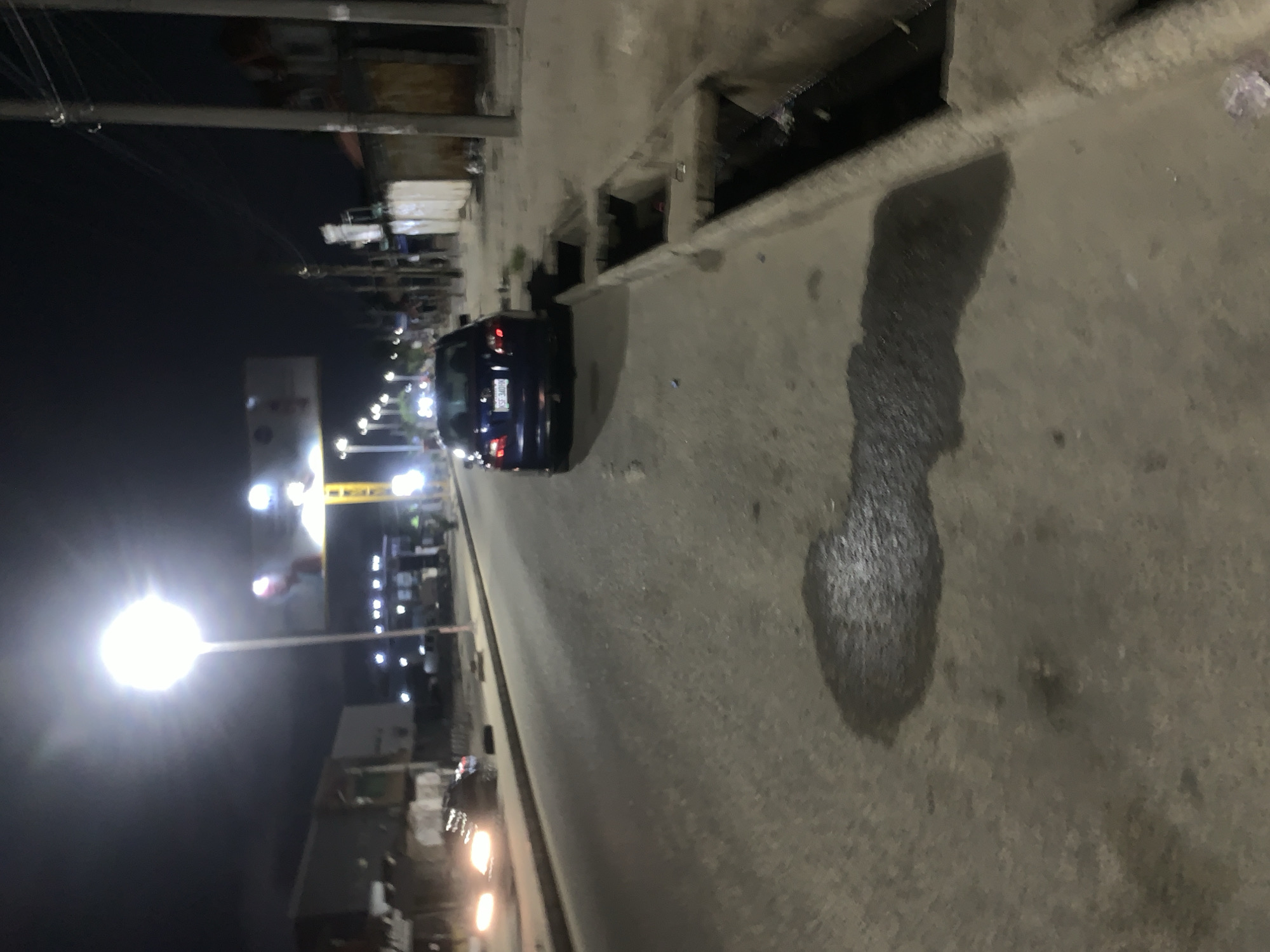 A night scene on a street in Ado, Nigeria, featuring a dark blue car parked next to the curb. The street is illuminated by a streetlight, and there are other lights visible in the distance, suggesting a commercial area. A dark patch is visible on the pavement.