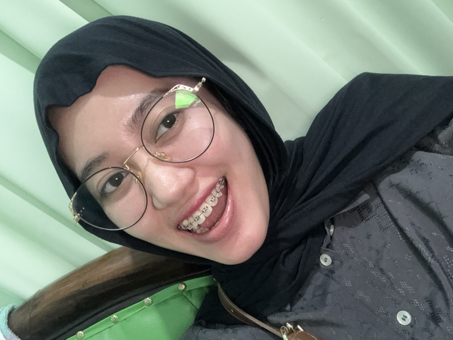 An individual is depicted in an indoor setting, purportedly located in Patrang, Indonesia. The subject is a female with medium skin tone, wearing a dark grey patterned long-sleeved shirt and a black headscarf (hijab). She wears round, gold-rimmed glasses and has clear orthodontic braces visible on her upper teeth. She is smiling broadly, with her mouth open, and gazing directly at the camera. The background consists of a light green wall or fabric, with a portion of a dark brown object, possibly furniture with green upholstery and metal studs, visible on the left side.