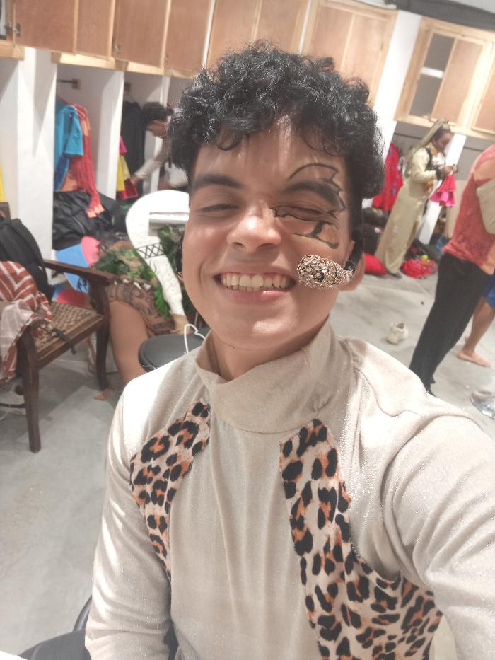 A smiling person with curly dark hair is wearing a sparkling cream-colored turtleneck shirt with leopard print patches on the shoulders. They have black makeup around one eye resembling a wing and a snake-like object near their mouth. The background appears to be a dressing room with lockers, costumes, and other people in various stages of dress.