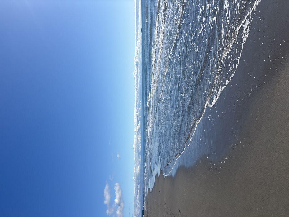 The image depicts a wide, sandy beach in Donji Štoj, Montenegro, under a clear blue sky with minimal cloud cover. The sky occupies the upper two-thirds of the frame, transitioning from a bright blue overhead to a lighter blue at the horizon, where a thin, elongated band of white clouds is visible across the distant sea. A few distinct white cumulus clouds are present on the far left horizon. The lower portion of the image features a dark grey to black sandy beach on the left, running diagonally from the bottom left corner towards the distant horizon. The sand appears damp near the waterline and slightly darker. To the right of the sand, the sea displays deep blue water with numerous parallel waves breaking and receding, generating white foam along the shoreline. No individuals, animals, or man-made objects are visible on the beach or in the water. The scene presents a natural coastal landscape under daylight conditions.