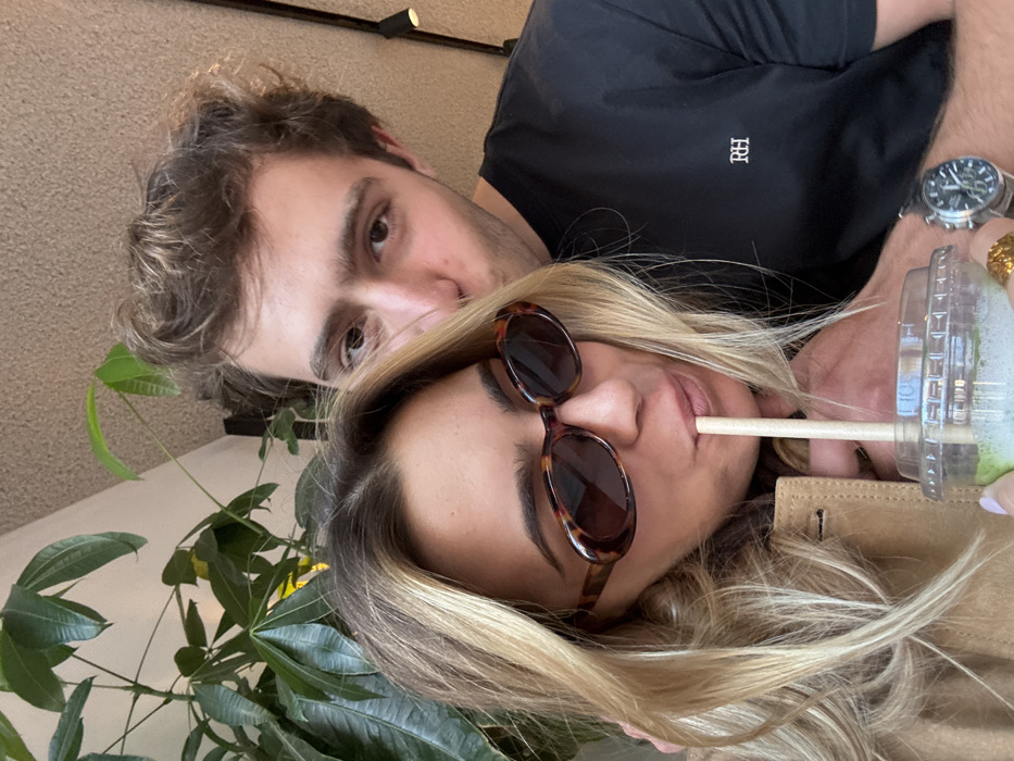 The image displays two individuals in an indoor setting, possibly a cafe or restaurant. The specific location within Eindhoven, Netherlands, cannot be determined from the visual information. In the foreground, a female with blonde hair and darker roots wears oval tortoiseshell sunglasses and a tan-colored coat. She is actively drinking from a clear plastic cup containing a frothy green and white beverage via a light-colored straw. Her left thumb, adorned with light-colored nail polish, is visible near the cup. Directly behind her, a male with wavy brown hair, wearing a black t-shirt with a white "RH" logo on the left chest, is positioned with his face close to hers, appearing to kiss her left cheek. His left arm is around her, and his hand is visible near her neck/shoulder. He wears a silver-toned wristwatch on his left wrist and a gold-colored ring on his right ring finger. The background features a large green plant with multi-lobed leaves and a light-colored, textured wall or ceiling with a black track light fixture.