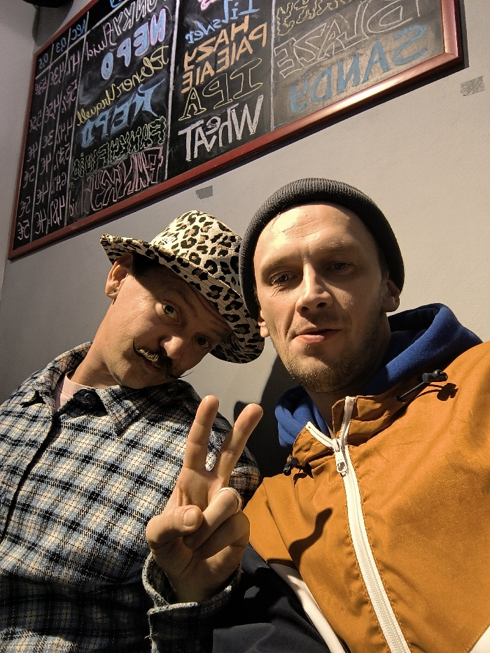 Two men pose for a selfie. The man on the left wears a leopard-print hat and a plaid shirt, sporting a drawn-on mustache. He holds up a peace sign. The man on the right wears a beanie and an orange jacket with a white zipper. Behind them hangs a chalkboard listing various drinks and prices in a bar or restaurant setting. Some of the drinks listed include "Wheat," "IPA," and "Haze."