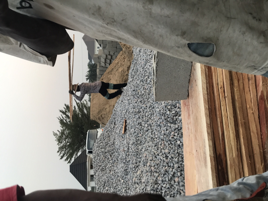 A construction site showcases various materials: piles of gravel, a stack of lumber, sand, and concrete blocks