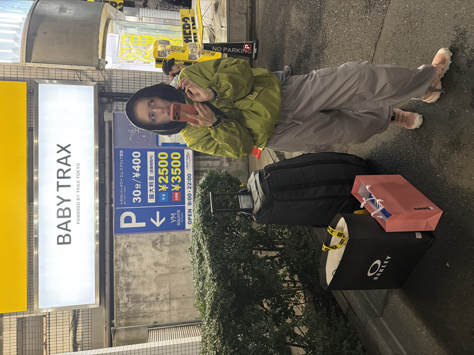 A female-presenting individual stands on a city sidewalk in Jingumae, Shibuya-ku, Tokyo, Japan, at night or dusk. She is positioned slightly right of center, wearing a light green hooded jacket, light gray cargo pants, and light pink athletic shoes. Her hood is up, framing her face, which is turned slightly to the left with a neutral expression. She holds a red smartphone with both hands, positioned in front of her torso. To her left, a black wheeled duffel bag with an extended handle stands upright. In front of the duffel bag are two shopping bags: a large black Oakley bag with a yellow strap visible inside, and a smaller pink Atmos bag. Behind her, a dense green hedge lines a concrete building facade. Above the hedge, a blue rectangular parking sign indicates "P" with a left arrow, "トラストパーク・エイム・スクエア原宿" (Trust Park Aims Square Harajuku), parking rates (30 min/¥400), daily maximum rates (Weekday ¥2500, Saturday/Sunday/Holiday ¥3500), and operating hours (Open 9:00 - 22:00), along with "VM SQUARE". Above this, a large illuminated white sign with a yellow top border displays "BABY TRAX" and "POWERED BY TRAX TOKYO." To the far right, yellow architectural elements or art installations are partially visible, along with a partial "NO PARKING" sign and faint figures in the background. The ground is paved and appears damp.