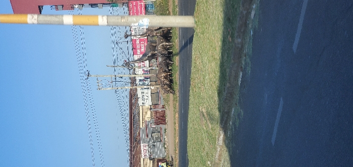 A sideways street view reveals a blue sky punctuated by power lines. Several giraffe sculptures cluster near billboards and buildings along the roadside. A grassy verge separates the structures from an asphalt road, marked with white lines. A portion of a striped horizontal structure dominates the upper part of the image.