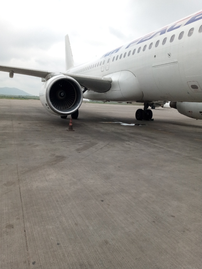 A white passenger aircraft, identified by "AIR PEACE" livery on its fuselage, is parked on a light grey concrete apron at an airport in Unknown, Nigeria, under an overcast sky. The aircraft's left side is presented, showcasing the turbofan engine with its exposed fan blades, the extended left wing, and a portion of the main landing gear. A single orange traffic cone is placed on the concrete near the front of the left engine. A small, irregular puddle of liquid is visible on the tarmac directly beneath the aircraft's fuselage, forward of the main landing gear. Distant green hills are visible under the horizon line in the background. No people or active operations are present in the frame.