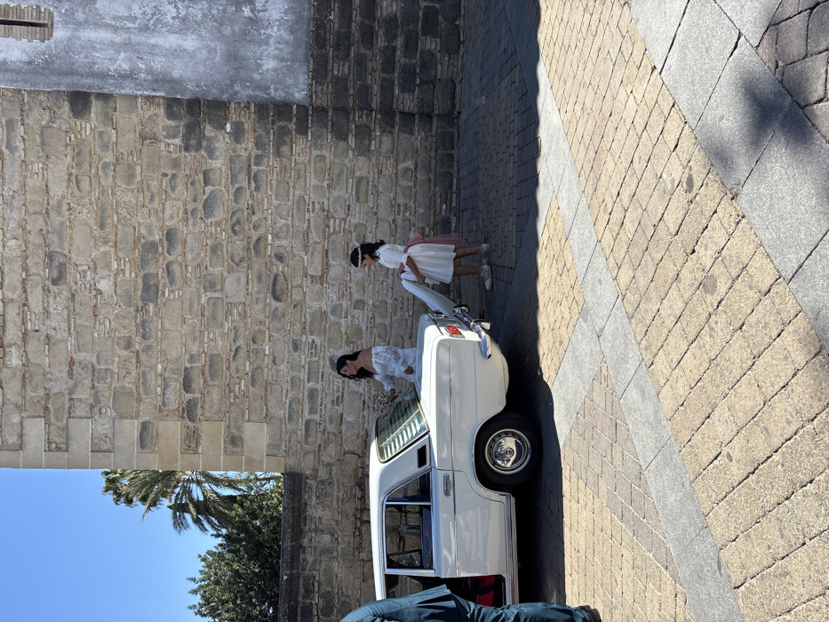 The image depicts an outdoor scene in Jerez De La Frontera, Spain, featuring three individuals and a vintage white sedan parked on a paved surface next to a stone building wall. In the center, an adult female with dark hair, wearing an off-the-shoulder white dress and holding a white bouquet in her left hand, stands near the rear of the white car. To her right, a young girl, wearing a white dress with a pink sash, white shoes, and a floral headband, holds a long white fabric, possibly a dress train or veil, which extends from the adult female's attire. Both individuals face slightly to the left of the frame. The car is a white, four-door sedan, identifiable as a Lada 1500 or similar Fiat 124 derivative, with its rear passenger-side door open, revealing a red interior. The vehicle is positioned on a ground surface composed of light yellow brick-like pavers laid in diagonal patterns, interspersed with gray stone strips. The background is dominated by a tall, ancient-looking stone wall constructed from irregularly sized and colored stone blocks. To the far right, a section of a darker gray, possibly rendered, building or tower extends upwards, featuring a small rectangular opening near its top. In the upper left background, above a lower stone wall, green foliage and a tall palm tree are visible against a clear blue sky. Bright sunlight casts distinct shadows on the paved ground. A partial view of a person's legs and lower torso, clad in dark trousers and a blue-green top, is visible on the far left, adjacent to the open car door.