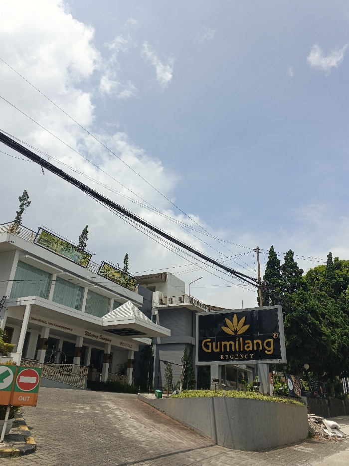 A multistory building with a covered entryway stands on a paved road. The building's facade is a mix of white and gray tones. A large sign on the right displays "Gumilang Regency" in bold letters with a gold, floral emblem above. Overhead, a network of electrical wires crisscrosses against a light blue sky with scattered clouds. An "OUT" sign with green arrows sits to the left of the building's entrance. Trees are visible on the right and in the background.