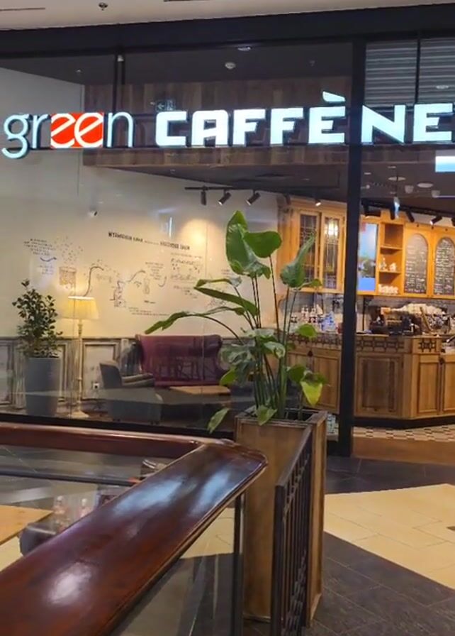 exterior of a Green Caffe Nero coffee shop in a mall. The cafe has a wooden counter with food displays and a barista visible inside. Outside, there are plants in wooden planters and a blue sofa. The floor is tiled with a geometric pattern. A chair with a jacket and backpack sits near the cafe entrance. The overall lighting is bright from the mall’s ceiling lights.