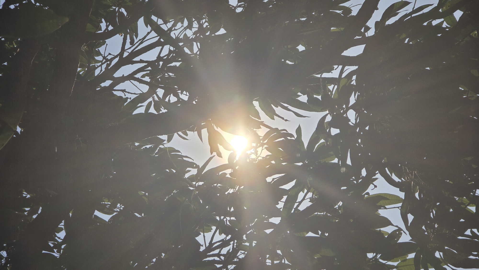 The image depicts the view looking up through the dense foliage of a tree, with sunlight streaming through the leaves