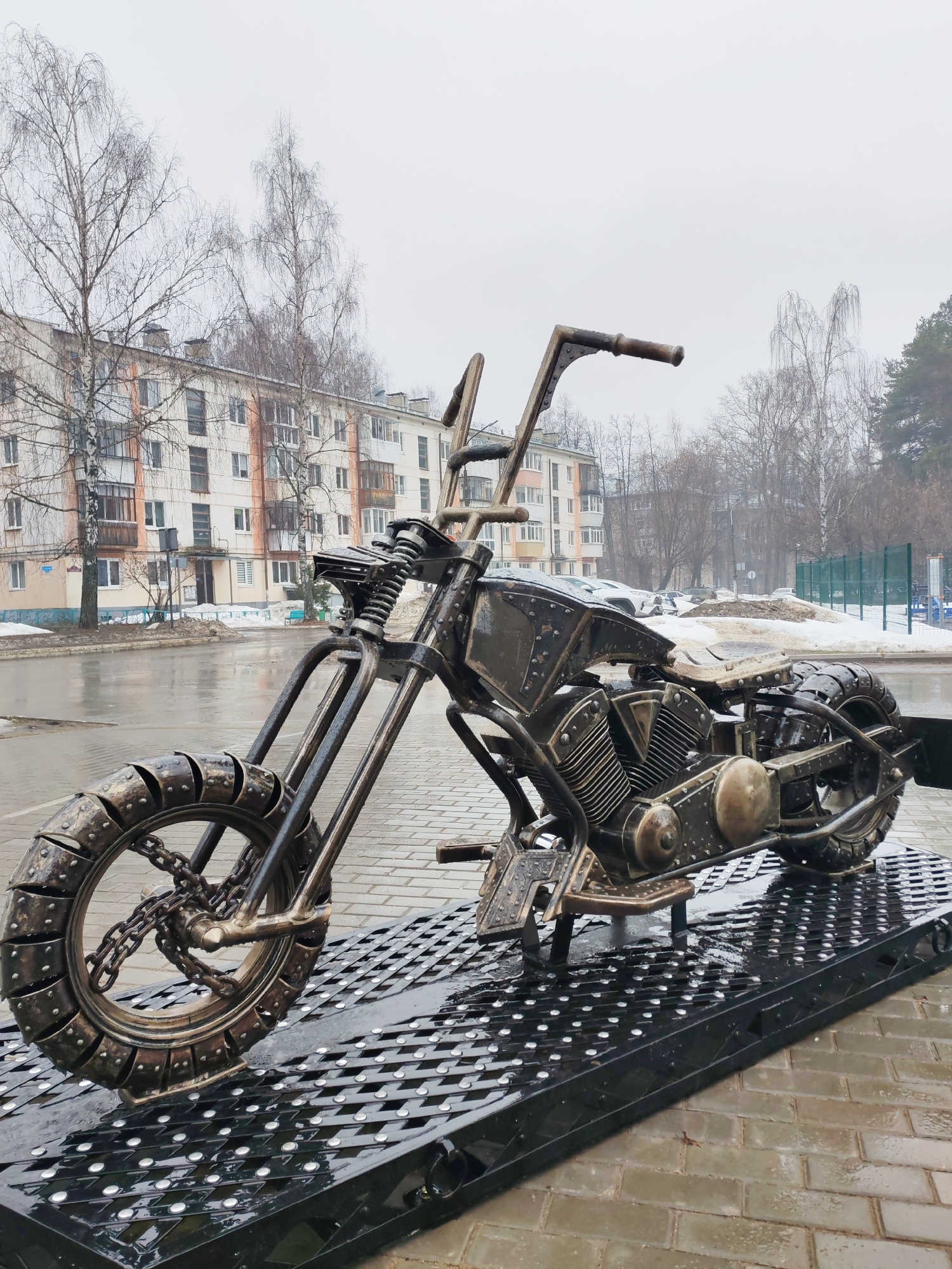 metal sculpture of a motorcycle, a custom-built chopper, on display outdoors in what appears to be the city of Chaikovsky, Russia