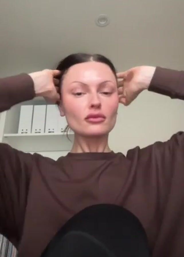 A woman with light skin and reddish-brown hair tied back is centered in the frame, wearing a brown long-sleeved shirt and black pants. She’s sitting, possibly cross-legged, looking directly at the camera. She raises both hands to the back of her head, her fingers spread, as if adjusting or tying her hair up. Behind her is a white wall with a recessed shelf unit containing several white binders. The lighting is bright and even. A circular light fixture is visible on the ceiling above. The perspective is from a slightly low angle, as if the camera is placed on a lower surface.