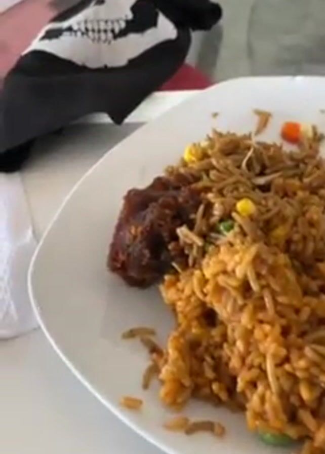 A person in a camouflage shirt is seen on video using a spoon to mix rice and vegetables on a white plate. A piece of fried chicken is next to the rice. A black shirt with a skull design is visible in the upper left corner of the shot. The table is white. The background is blurred, but pink and red elements are visible.