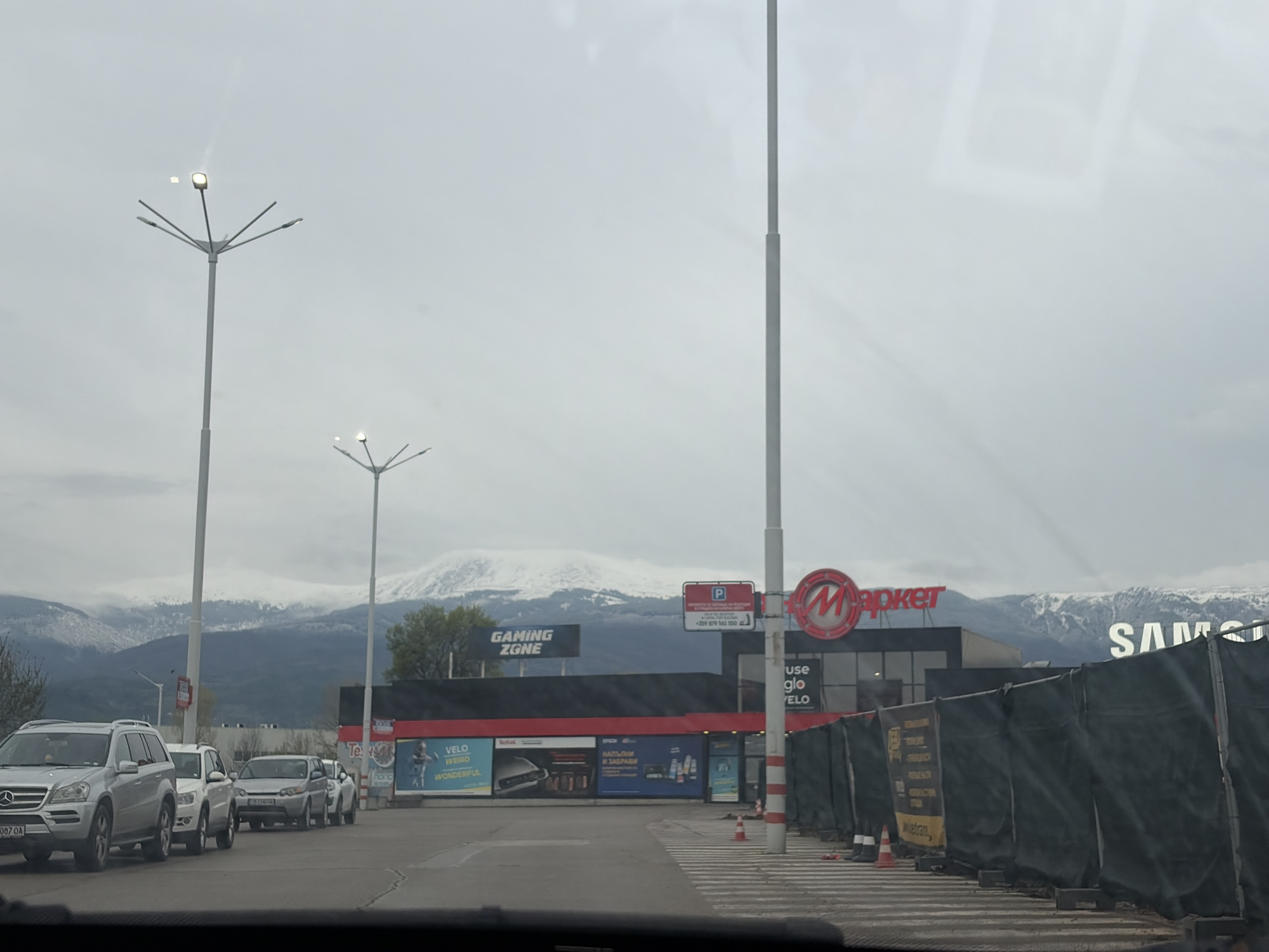 M-Market on the outskirts of Sofia, Bulgaria. In the foreground, a row of parked cars on a road leads towards the store's entrance. The store features a red and white logo with the name "M-Market." A sign next to the entrance indicates a phone number and parking information. There's also signage promoting "GAMING ZONE" and "VELO WEIRD WONDERFUL." Construction or renovation appears to be underway, indicated by a dark green fence near the building. In the background, mountains covered with snow rise above the landscape, partially obscured by overcast skies. Three light poles line the road. The photo seems to be taken from inside a car.