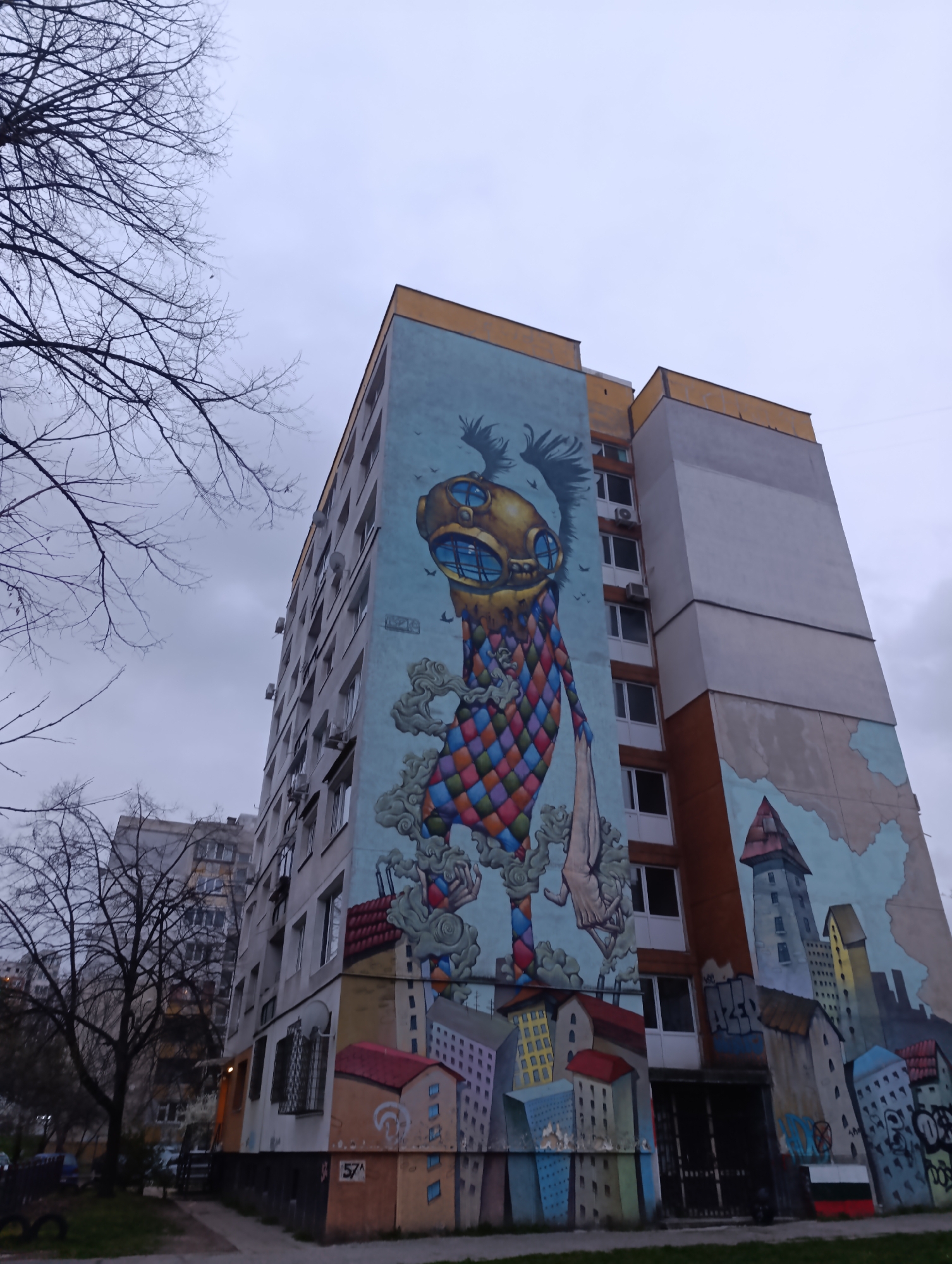 tall apartment building in Sofia, Bulgaria, adorned with a large mural. The mural features a whimsical, colorful figure with a diving helmet-like head and a harlequin-patterned body, standing amid a cityscape of smaller buildings. The sky is overcast and the bare branches of trees are visible in the foreground. Other buildings can be seen in the background, along with parked cars, and a sidewalk at the bottom of the frame. There are windows on the apartment building that are separate from the mural. The building has different colored exterior walls of tan, orange, and grey. The mural appears to span the entire height of the building.