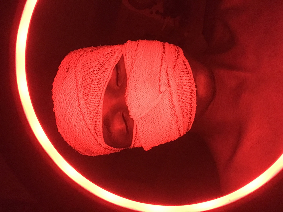 A person's head, swathed in a tight, textured bandage, dominates the frame. The eyes are closed. A luminous, circular neon light encircles the head, casting a strong red hue over everything. Hints of the person's body are visible, also bathed in the red light. The overall impression is intense and dramatic due to the color and framing.