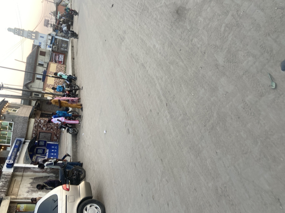 A street view features a parked car and a row of motorcycles along a building with storefronts, including one that appears to be a bank. People are standing near the motorcycles. A tall mosque minaret rises in the background amidst other buildings. The road surface is grey and textured. The scene is captured in daylight, with a slightly hazy atmosphere.