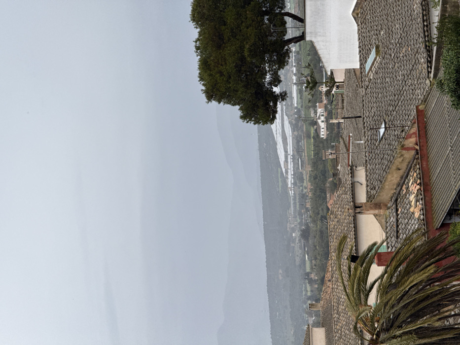 This image depicts a panoramic view of a city landscape merging with a rural valley, situated in Palma de Mallorca, Spain, under an overcast sky. In the immediate foreground, a portion of a large palm frond is visible on the left. The midground primarily features a dense collection of terracotta-tiled rooftops with multiple chimneys and television antennas, indicating residential or commercial structures. On the right, a significant portion of a white building wall rises, from behind which a dense, dark green tree with a prominent trunk structure grows. Below this, a smaller conifer-like tree is also present. Beyond the immediate rooftops, the landscape transitions into a green valley containing scattered buildings, vegetation, and notably, several large white agricultural structures, likely greenhouses, on a distant hillside. The background reveals multiple layers of hills and mountains, appearing muted and faded due to atmospheric conditions, receding into the light grey, cloudy sky. No human figures or discernible actions are visible within the scene.